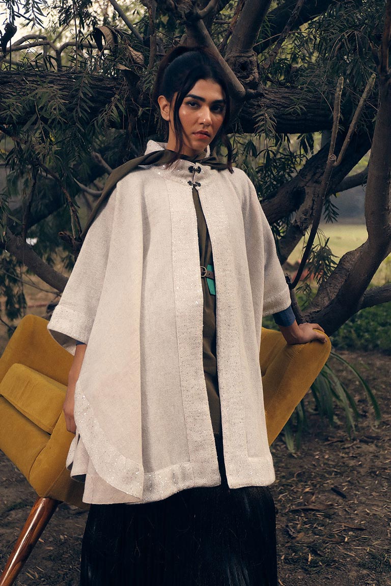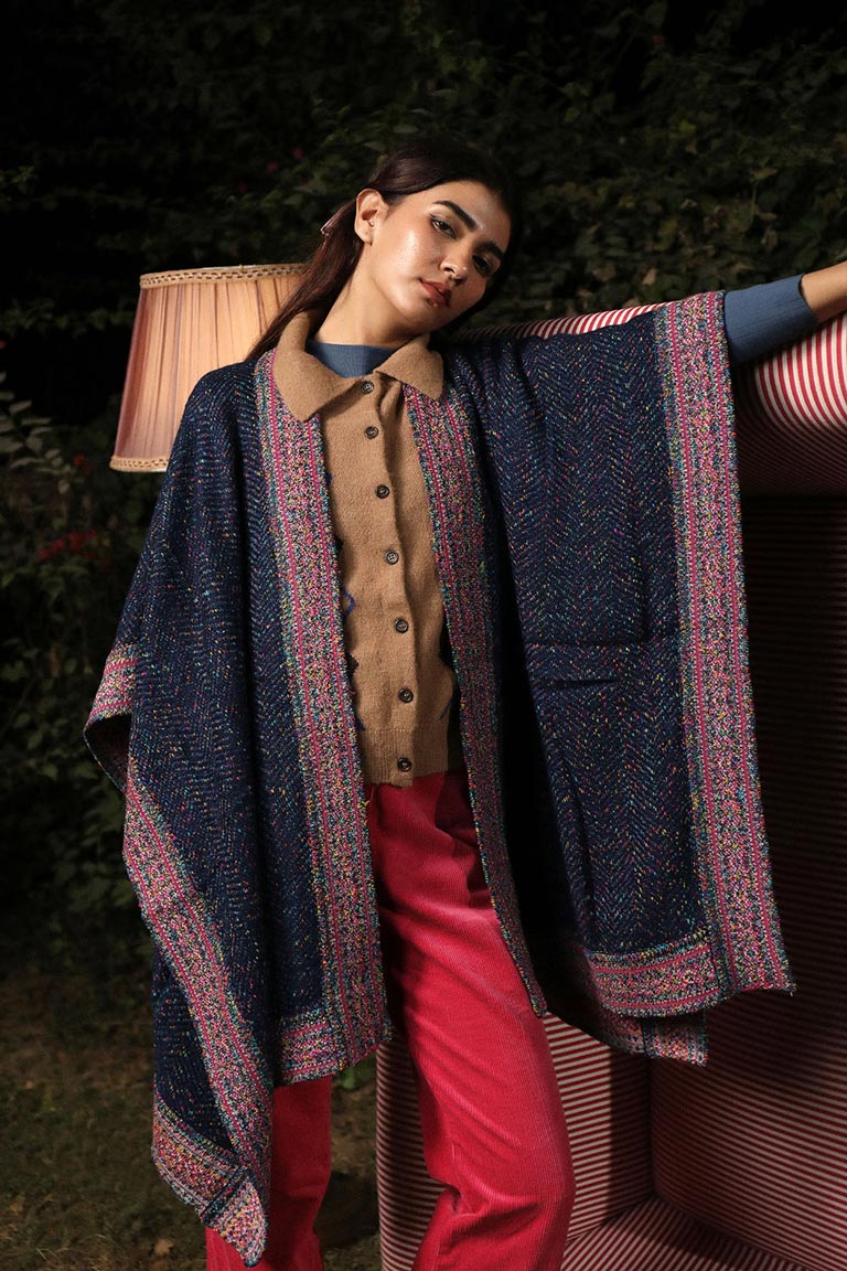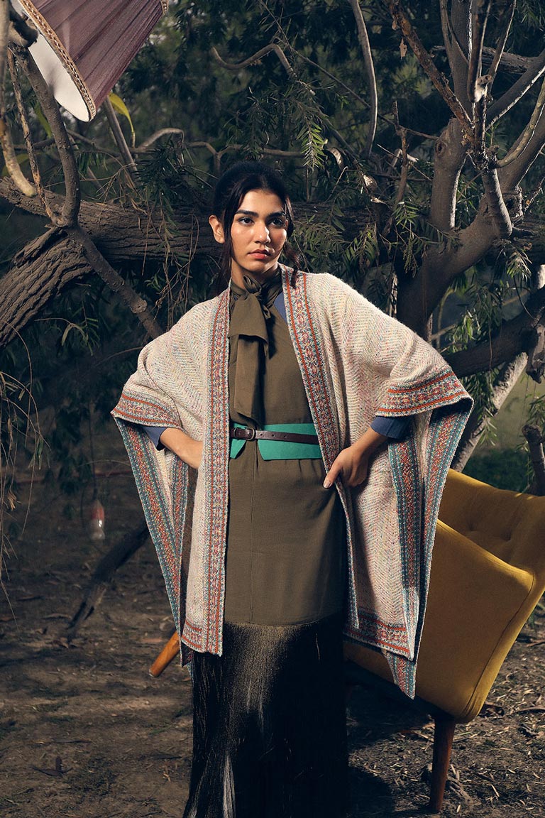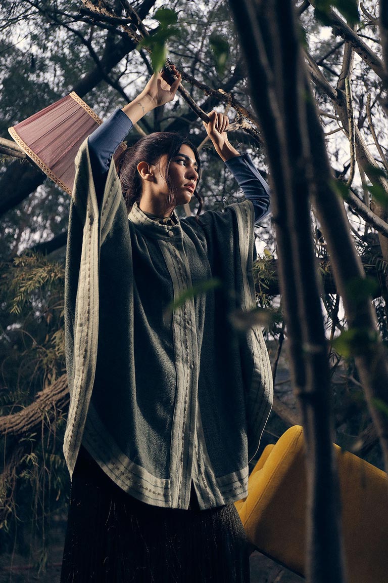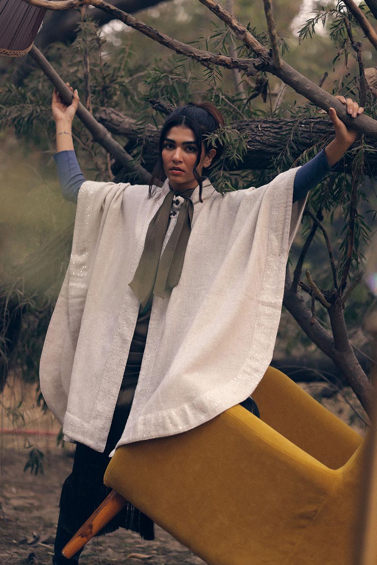 The cape is a canvas of quiet power — flowing, versatile, and effortlessly elegant. It moves with grace, offering warmth without weight, and presence without pretence. A timeless companion for the woman who carries the calm of the mountains within her.