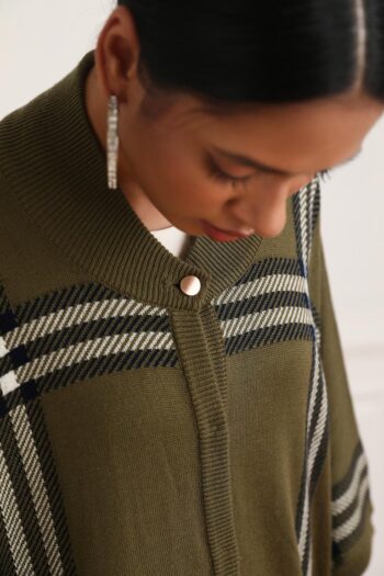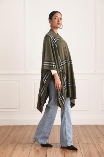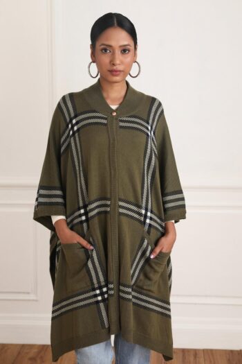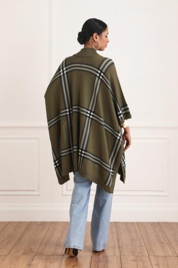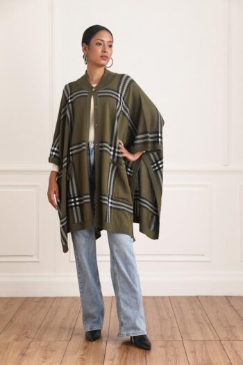 The Alana Tartan Cape is the perfect combination of style and comfort. Its tartan front closed cape with buttons is made from olive and black and white fabric, giving it a smart-casual look. Pair it with denims for an effortlessly chic look.