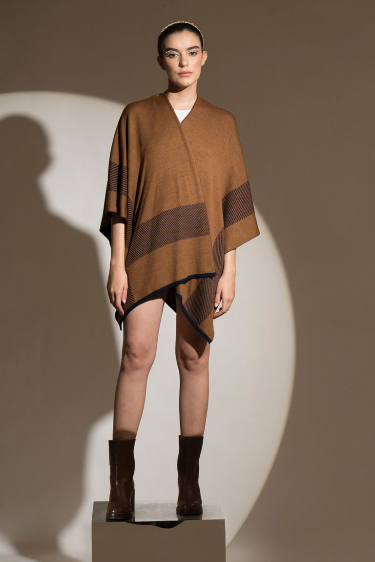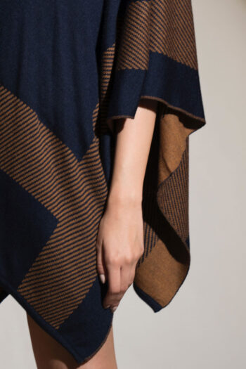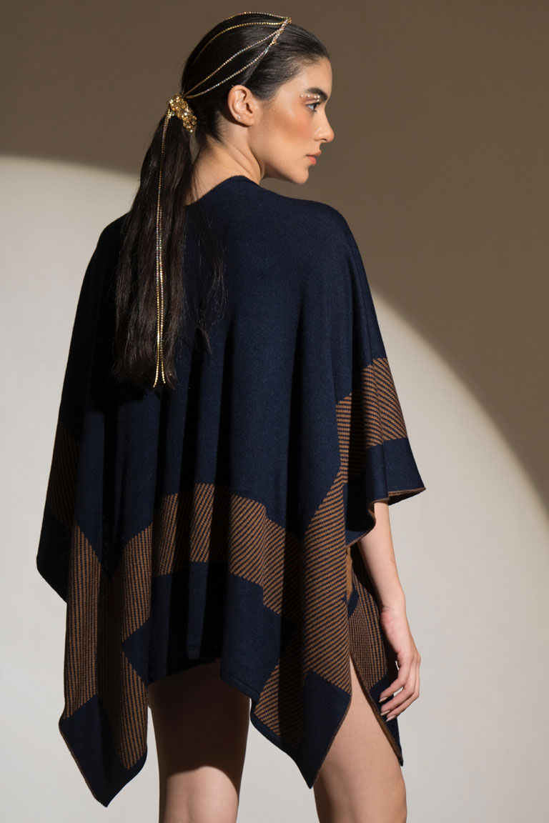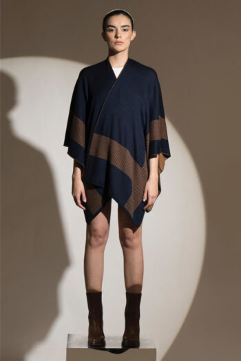 The short, fully reversible cape in two colours- navy and deep fawn is an irresistible choice to make. It works well with denims and a simple woollen dress and boots.