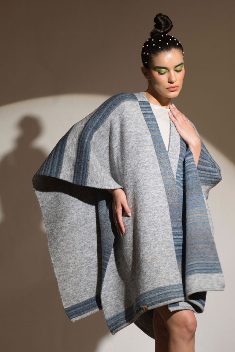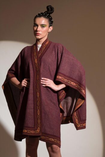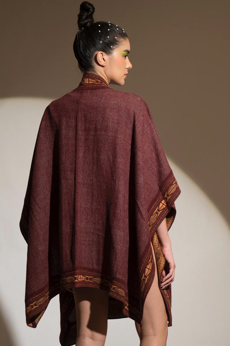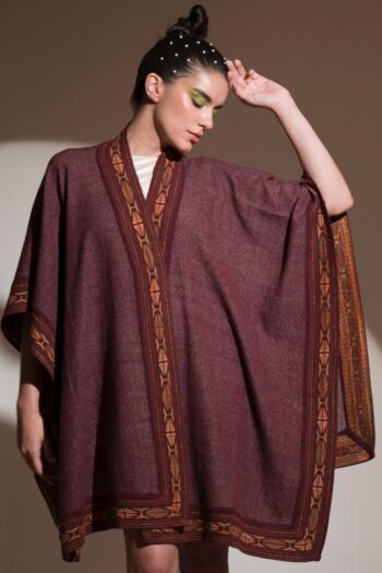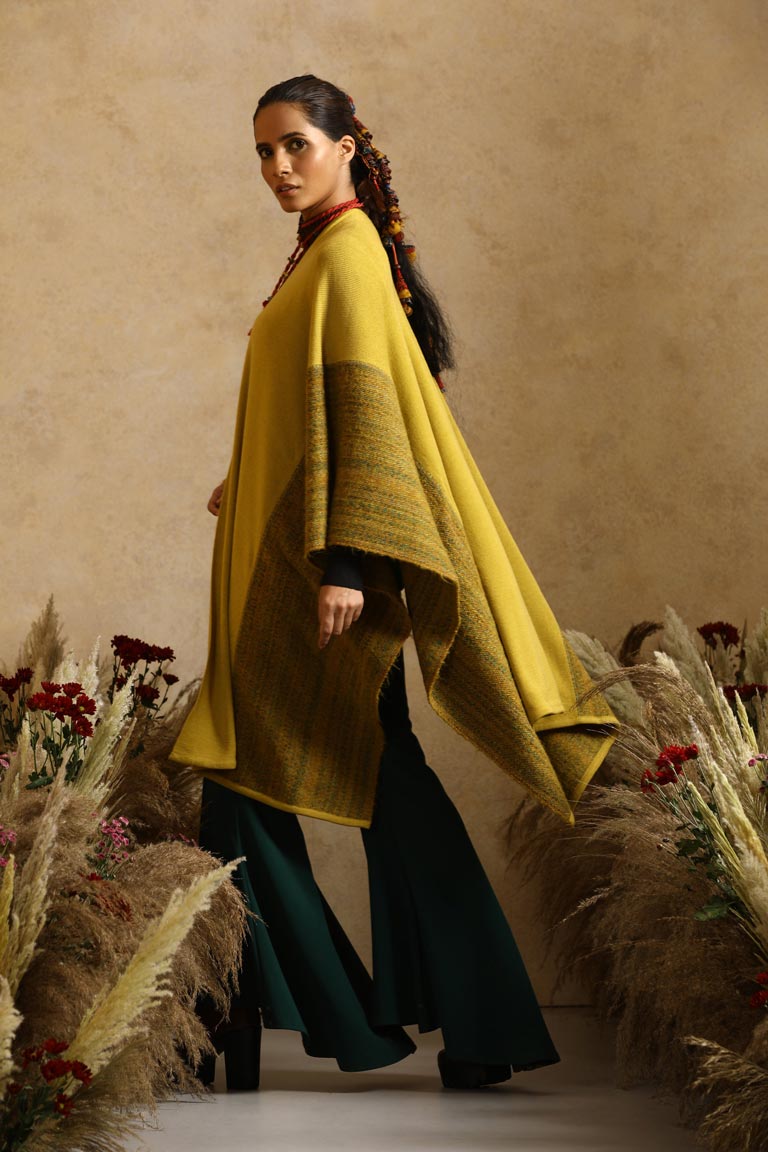 Handwoven with an exotic Kinnauri border, this cape is simply nonpareil. Striking, vibrant and very unusual, it promises to be a sure hit!