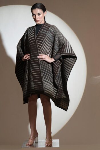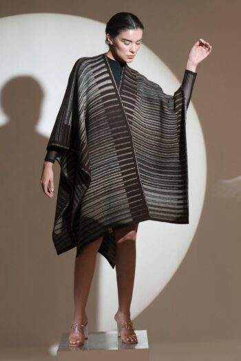Alternating between a rich hickory shade of chocolate brown with tortilla, you cannot go wrong with this soft, free-size lambs wool cape.