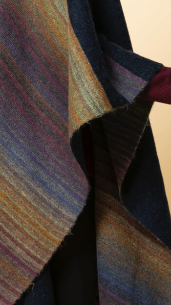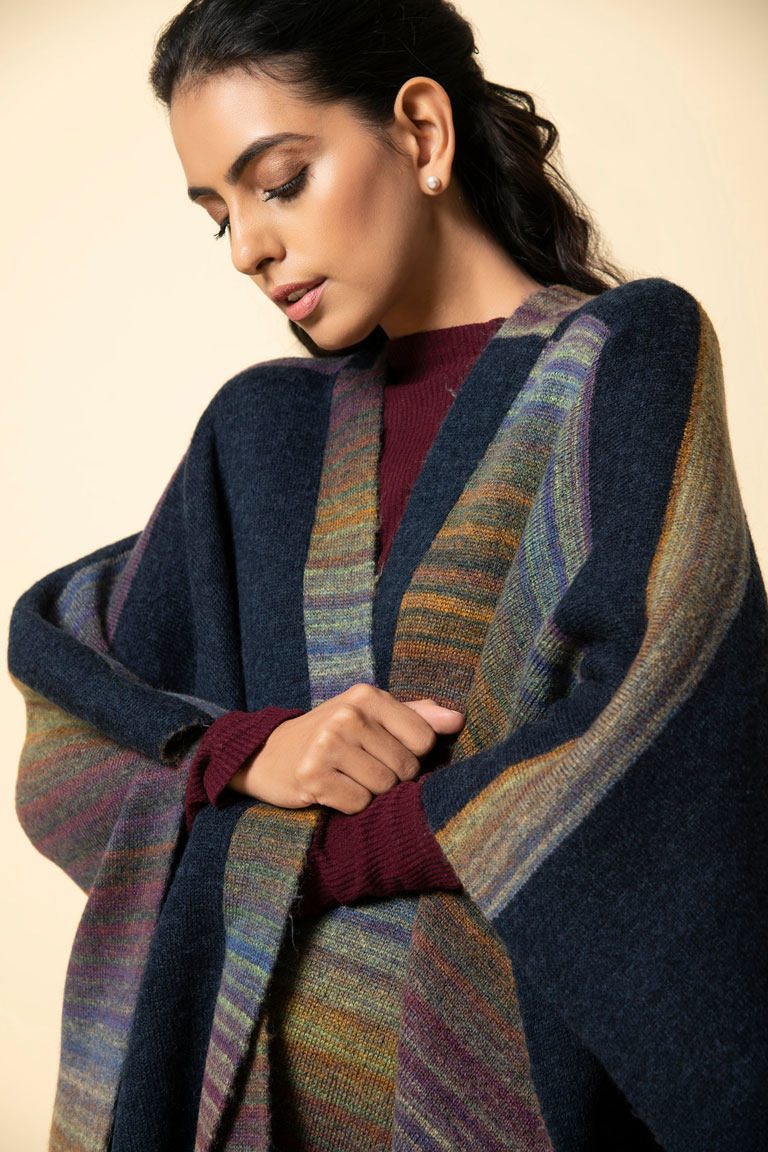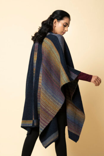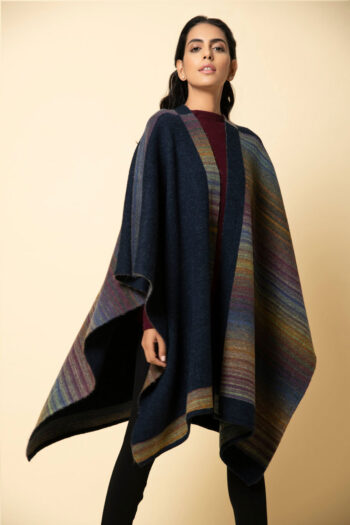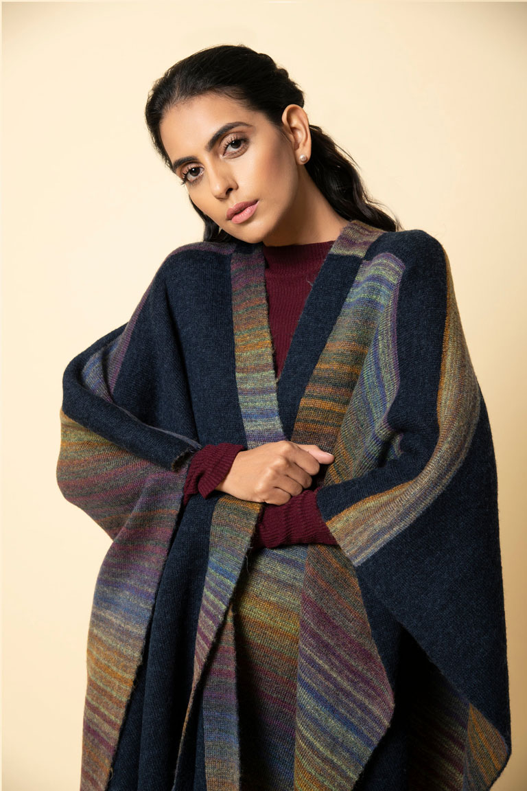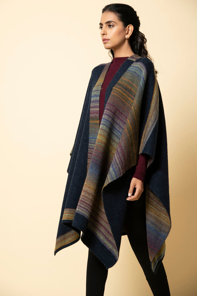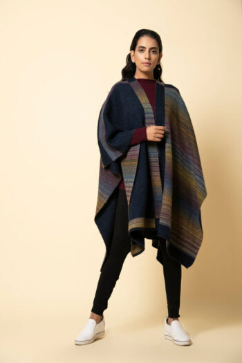 Soft yet warm, this navy and burgundy genuine lambswool cape has a unique design. One half runs plain whereas the other half is patterned through. The back is in reverse design. Bring in the new year with warmth and colour in one of our thickest capes. A welcome addition in the biting cold.