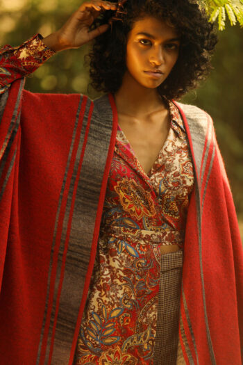 Thick and warm, this pure merino wool reversible cape will serve to keep you warm even on the coldest winter day. With grey stripes on one side and a brilliant coral colour on the other, the clever synchronicity of the two is what sets this cape apart from the rest. Dazzling and simply beautiful!