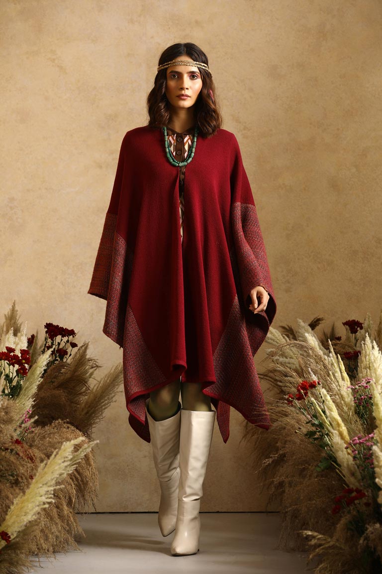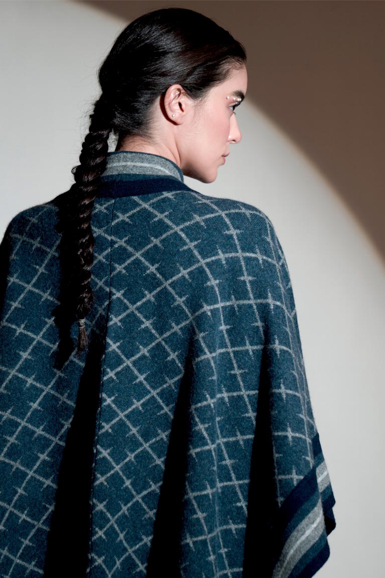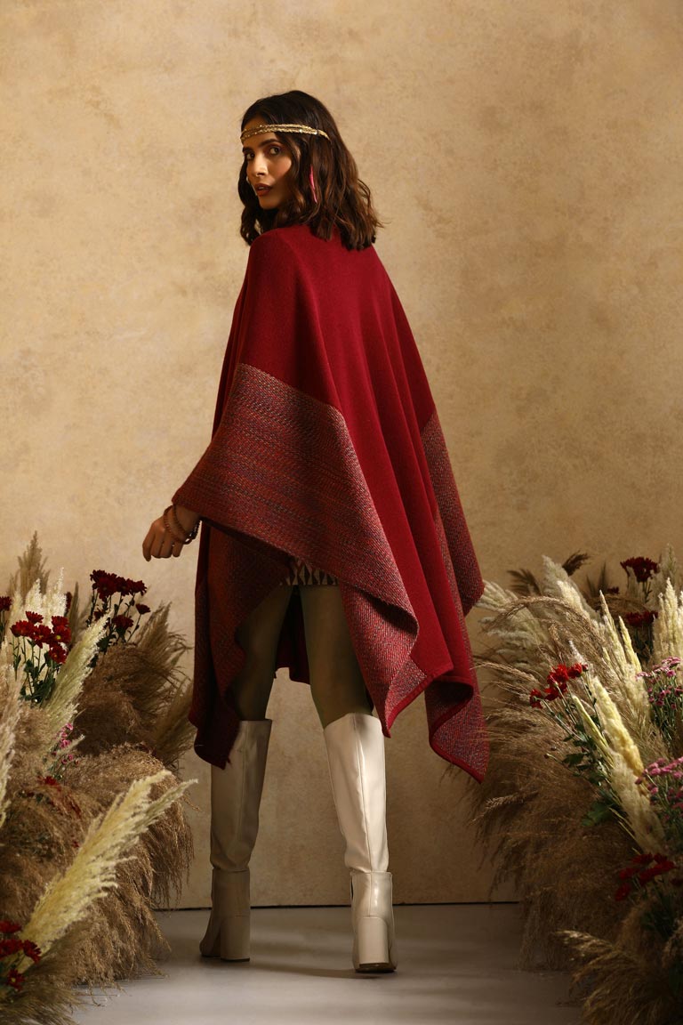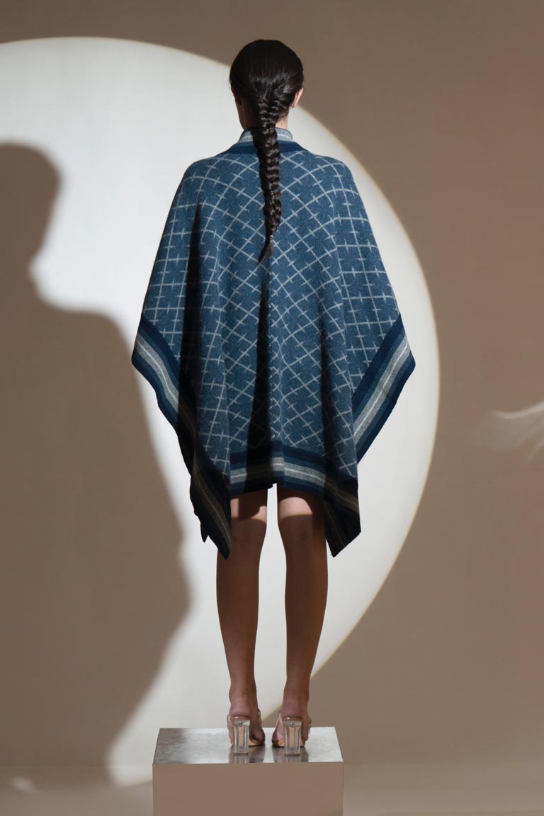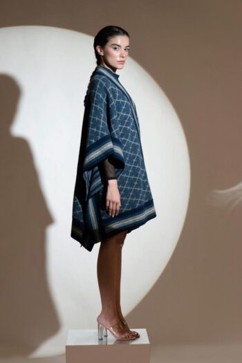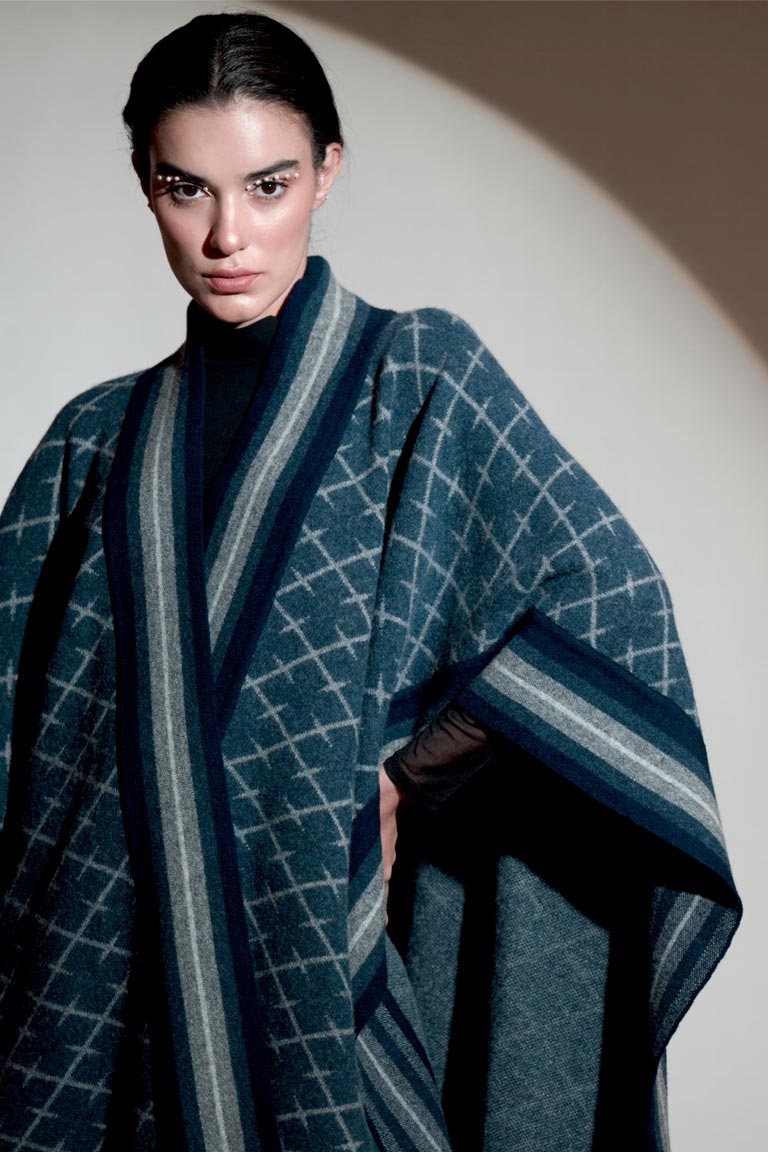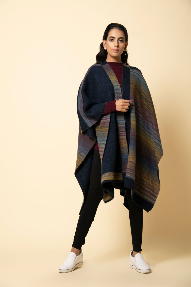 Matchless design with a thick side stripe border, this striking lambs wool cape is a sure winner! It has a unique abstract checkered design through its length and breadth.