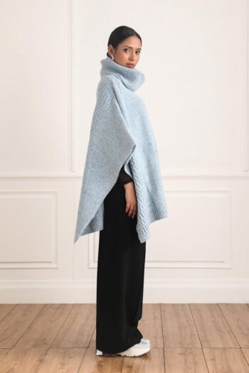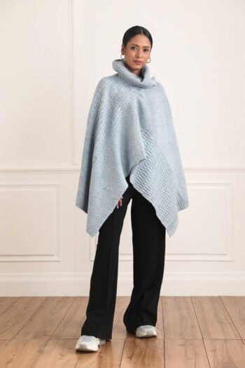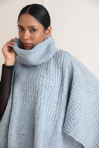 The Dorothea Poncho features a luxurious Nep woollen yarn cowl neck and a sky blue hue. It’s cozy and stylish, perfect for winter days and chilly evenings. Crafted from a unique blend of wool fibers, it offers warmth and comfort.