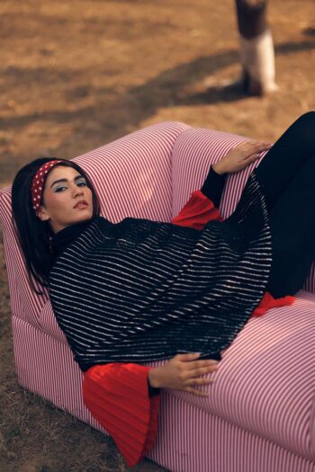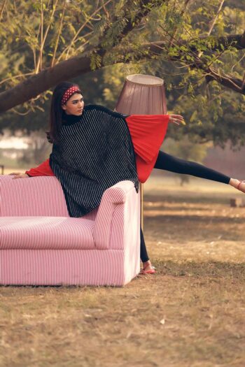 A striking black poncho elevated with subtle metallic striping that catches the light with quiet confidence. The fluid silhouette drapes effortlessly, while the soft knit base balances warmth with a refined, evening-ready sheen. Designed to transition seamlessly from understated daywear to polished night styling.