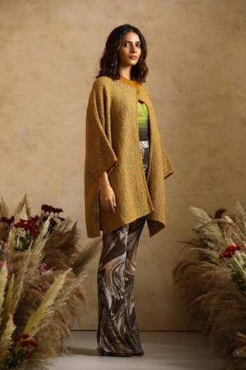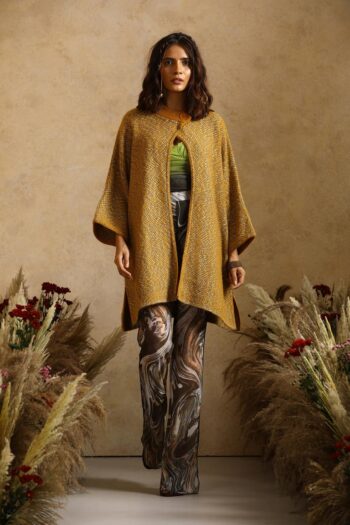 This collared cape is very easy to slip over your comfortable winter wear or you create a dressy look by pairing it with flared printed pants and boots.
