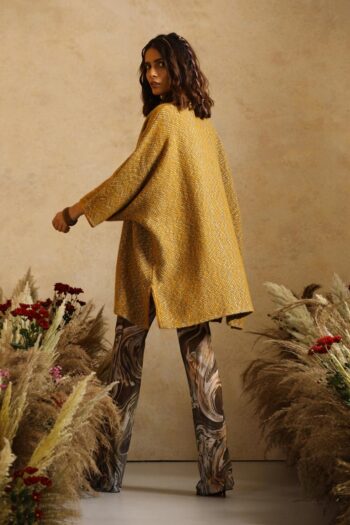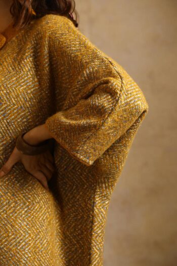 This piece of outerwear comes in a stunning mustard colour and the design is in a herringbone weave. It has loose sleeves and a buttoned collar neck.