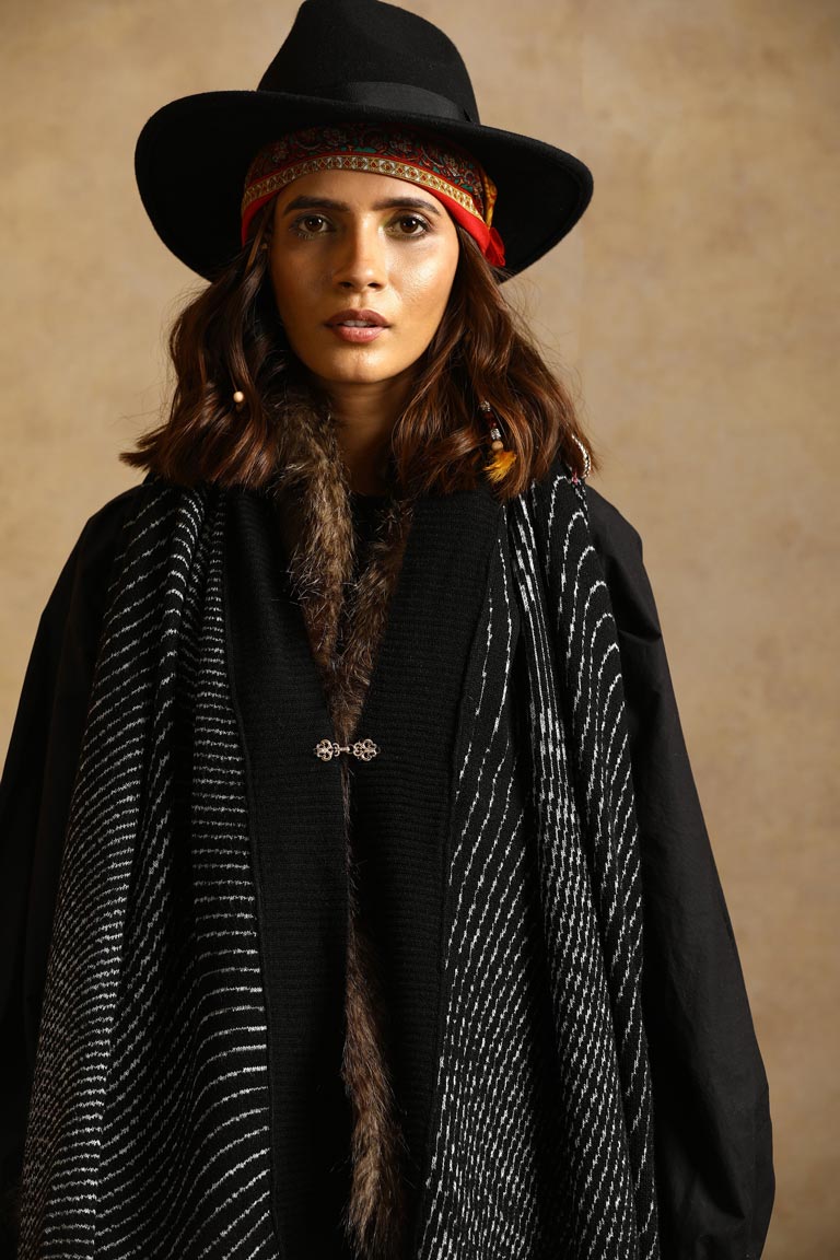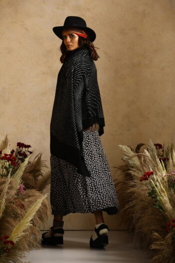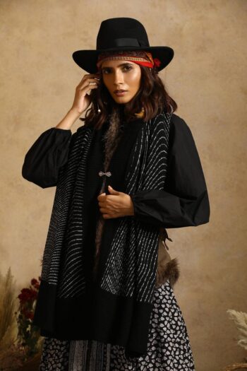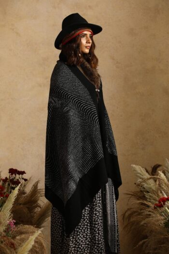 This black and white wrap has an all over pattern reminiscent of the longitudinal waves created when strumming a guitar. It is a made of pure lambswool and has a solid black border with a brooch style clasp in the middle.