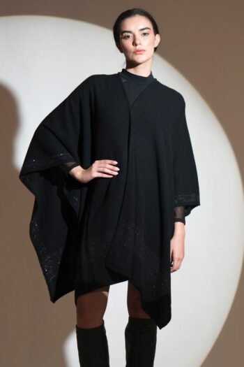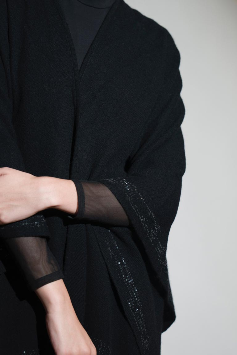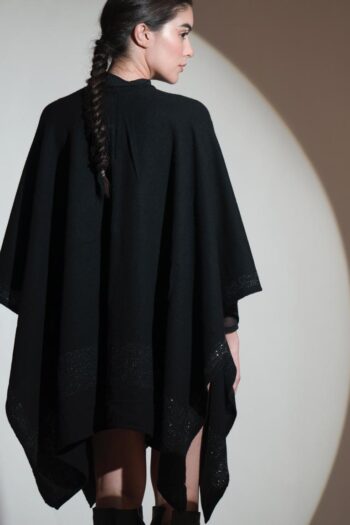 Delicately splattered sequins add to the daintiness of this black lambs wool cape. All handcrafted with care.