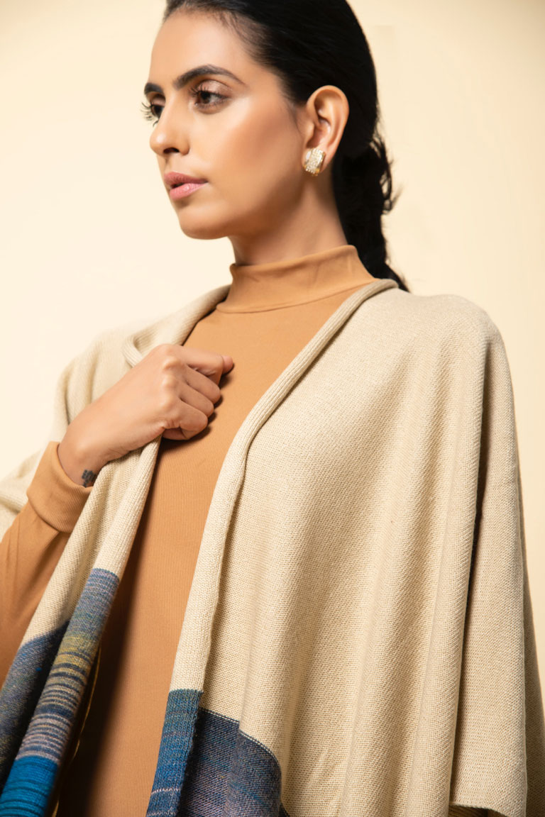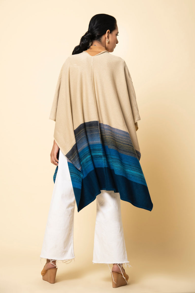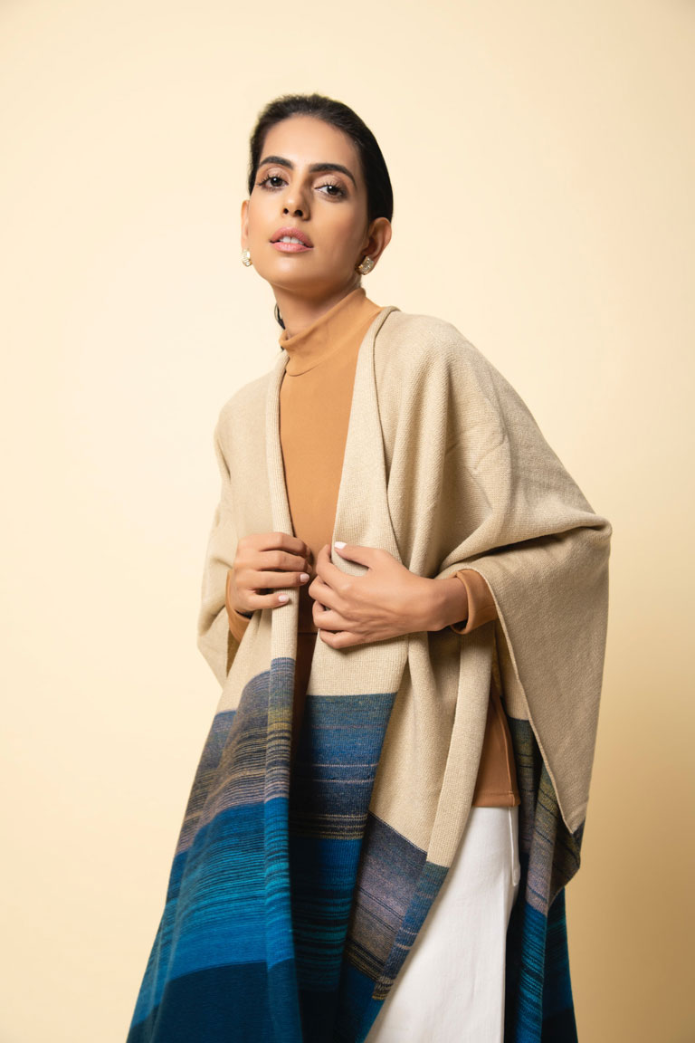 Rarely are colours used as ingeniously as this one to create a visual delight! Its striking blend of blues with a neutral beige lend it just the right amount of understated drama. This pure lambswool cape remains an all-time favorite for many.