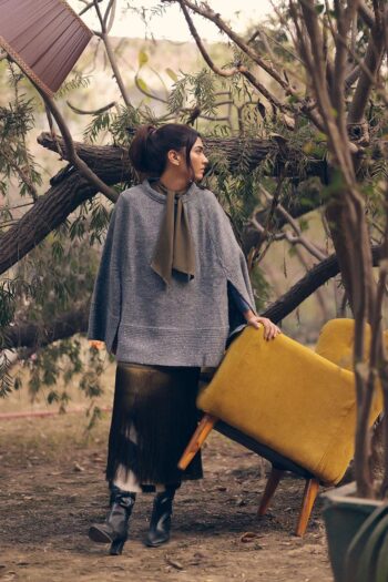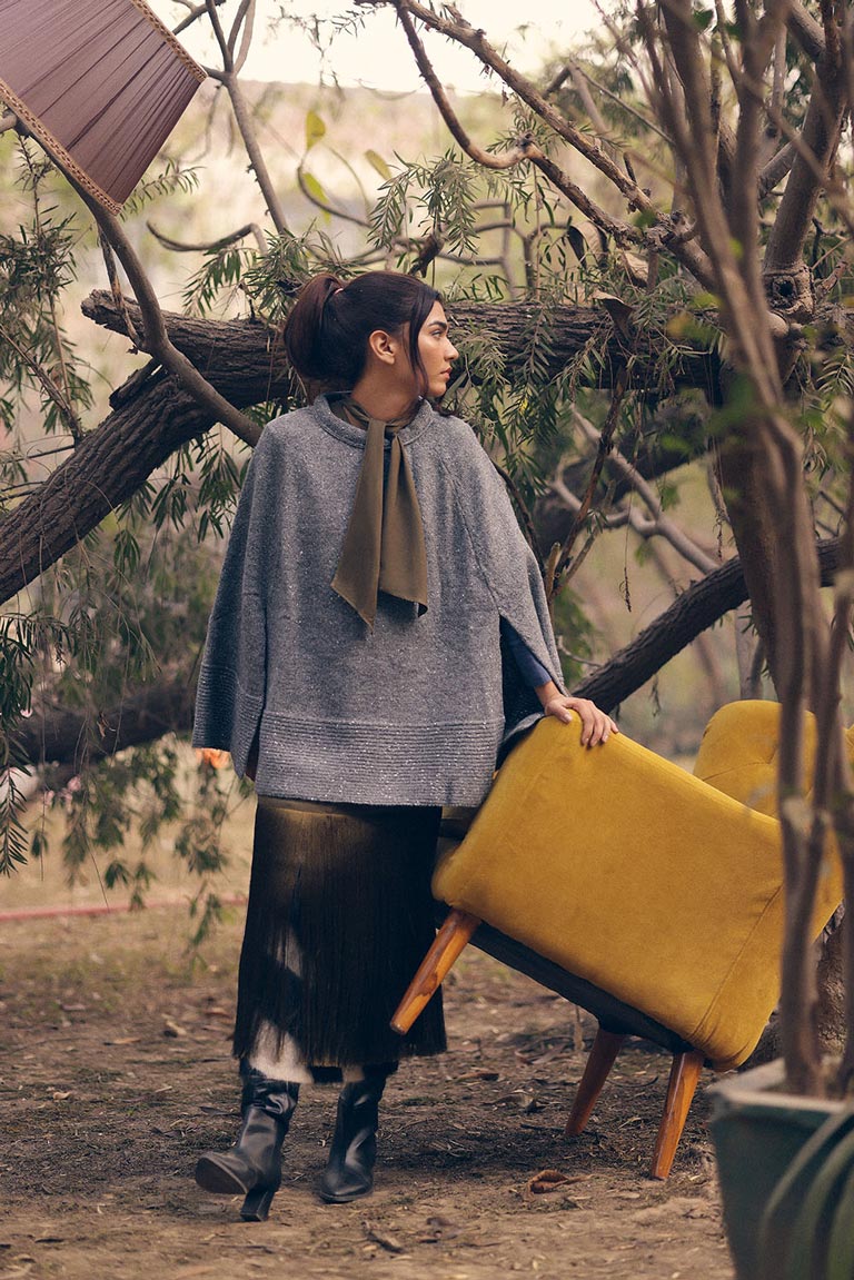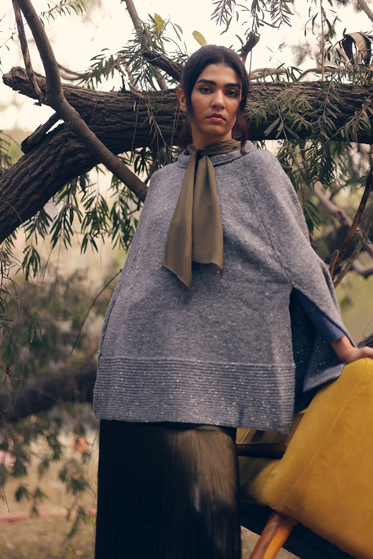 Sleek and versatile, the Moonlit Shimmer Poncho in grey is enriched with subtle sparkle threads, catching light with every movement for understated glamour.