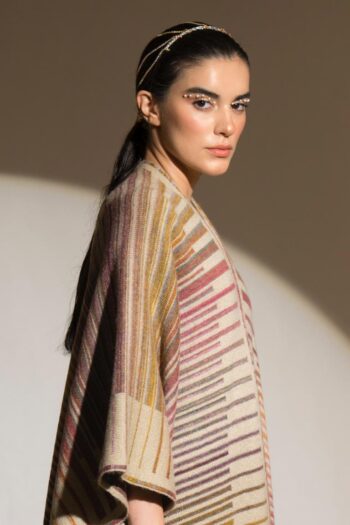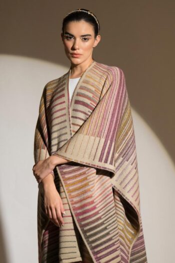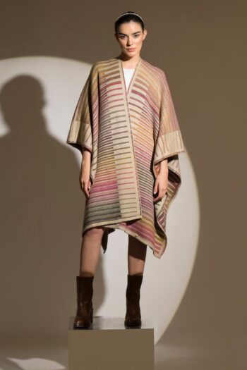 This ombré reversible thick cape in mouth watering shades of light brown, pink, mustard, dull green and mauve is like a canvas of colour.