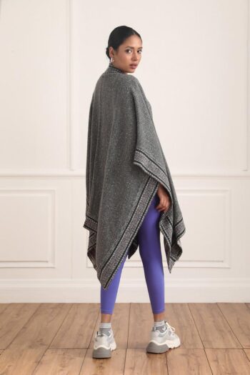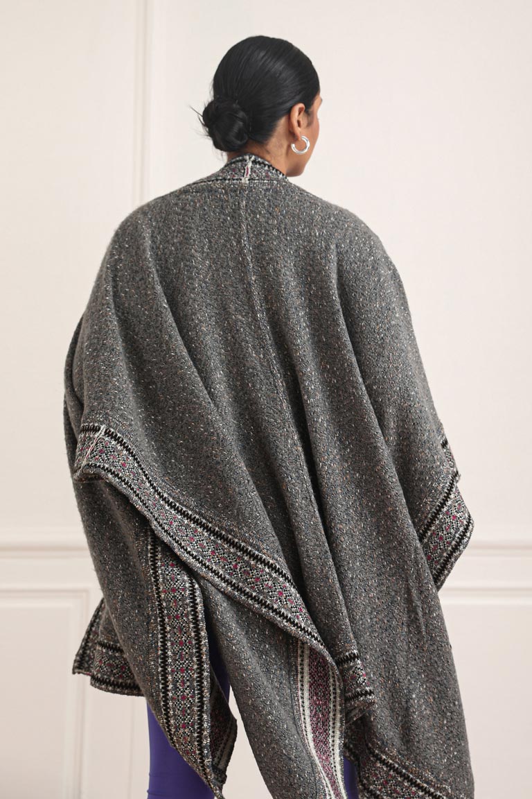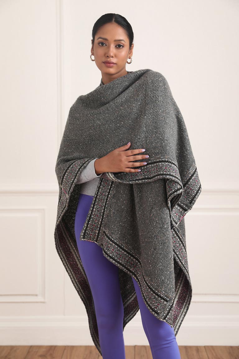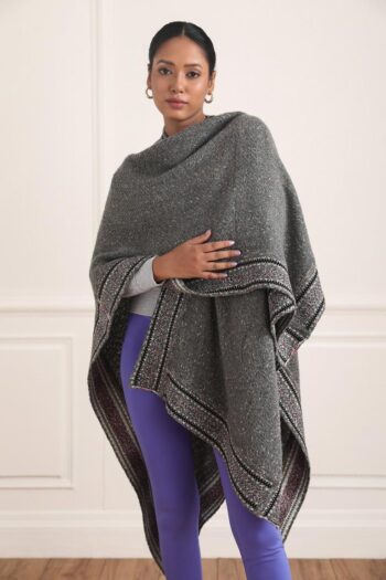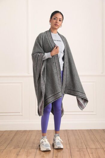 Wrap yourself in luxury with our Samantha Herringbone Weave Cape, a handwoven masterpiece. Its intricate herringbone weave, elegant jacquard border, and soft grey wool set off its multiple vibrant colours, perfect for an elegant and exclusive look.