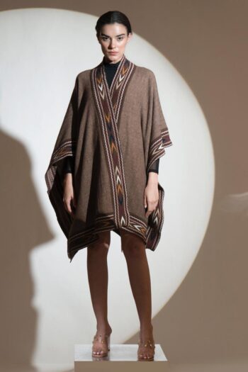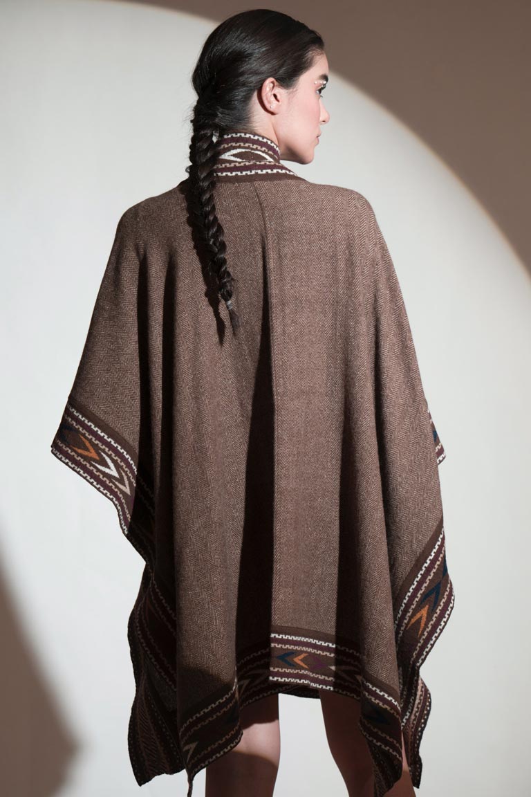 With Aztec border edges, this deep brown lambs wool is simply a classic. It is warm and a statement piece for your winter wardrobe.
