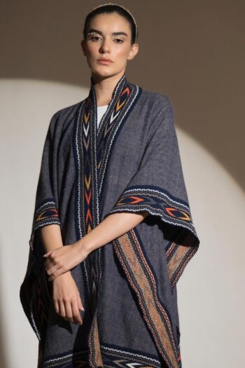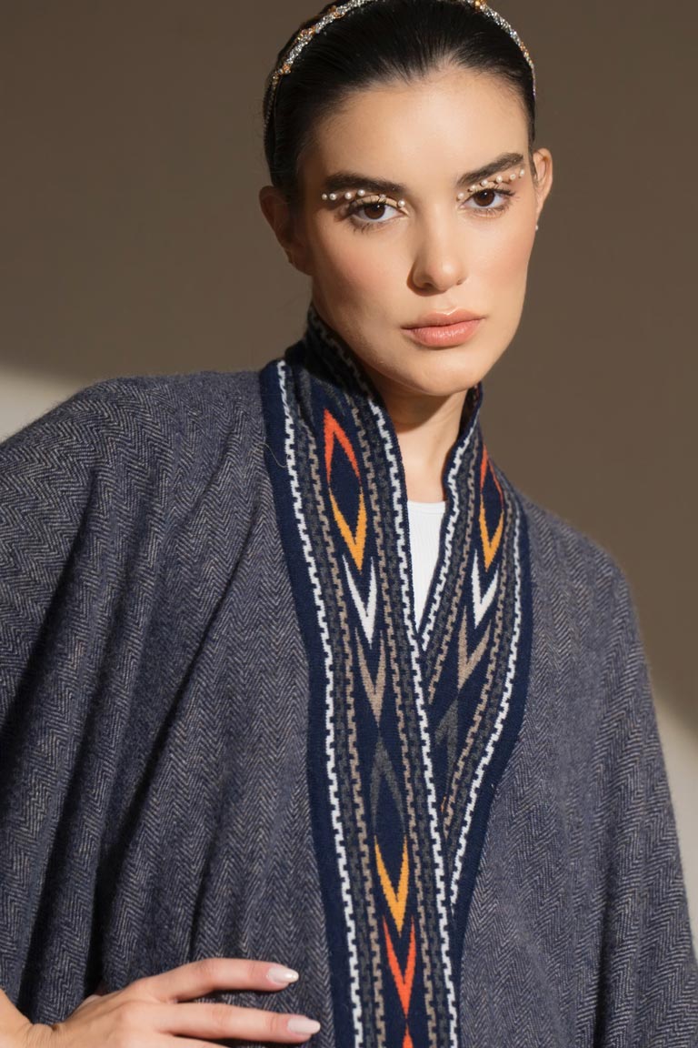 Fashion is instant language and our herringbone weave cape with an Aztec border speaks style and functionality.