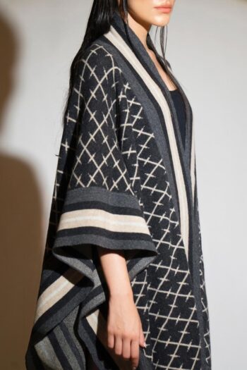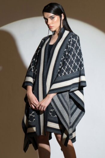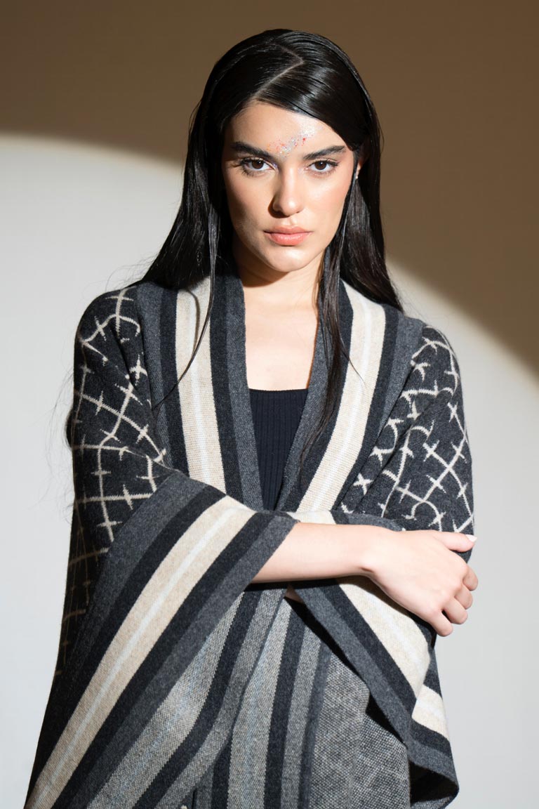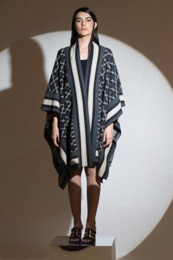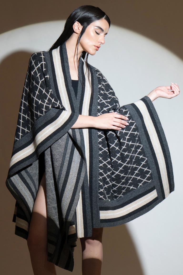 Almost as elusive as the Tahitian Pearl, this cape with its rare combination of stripe borders and an interlinked pattern running through out makes for a dramatic yet sophisticated visual impact. A statement piece and wardrobe staple, all at once.