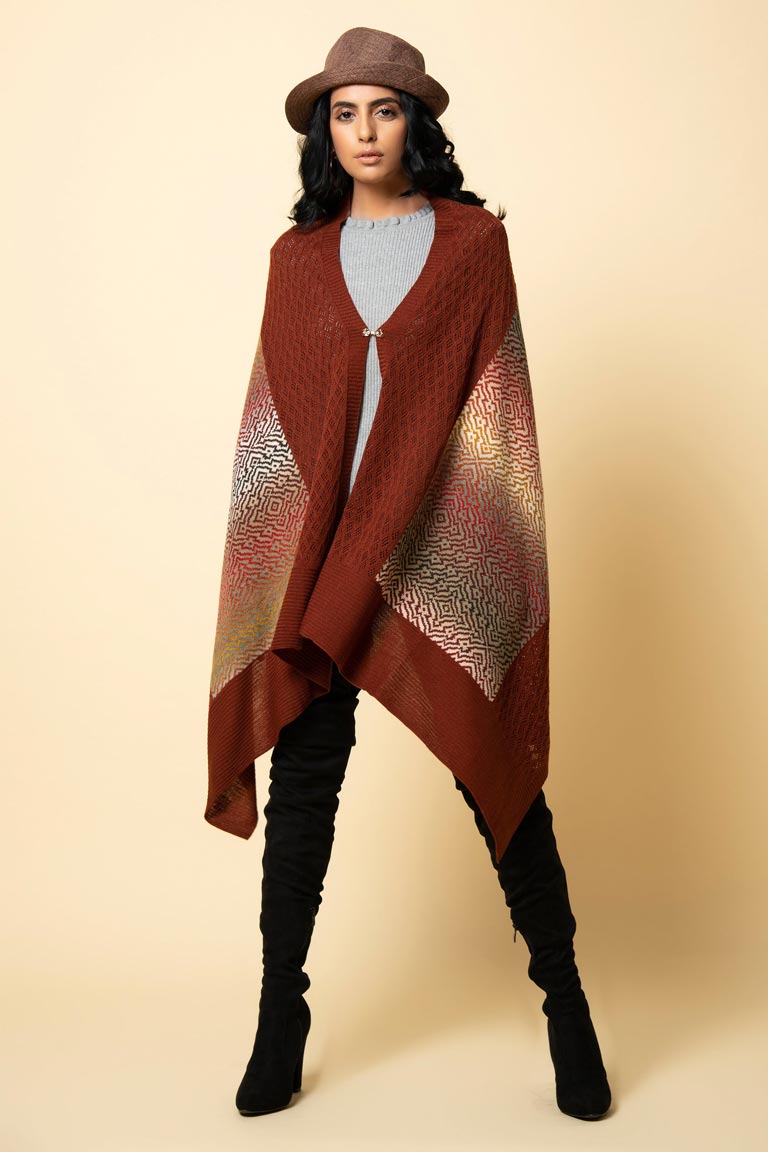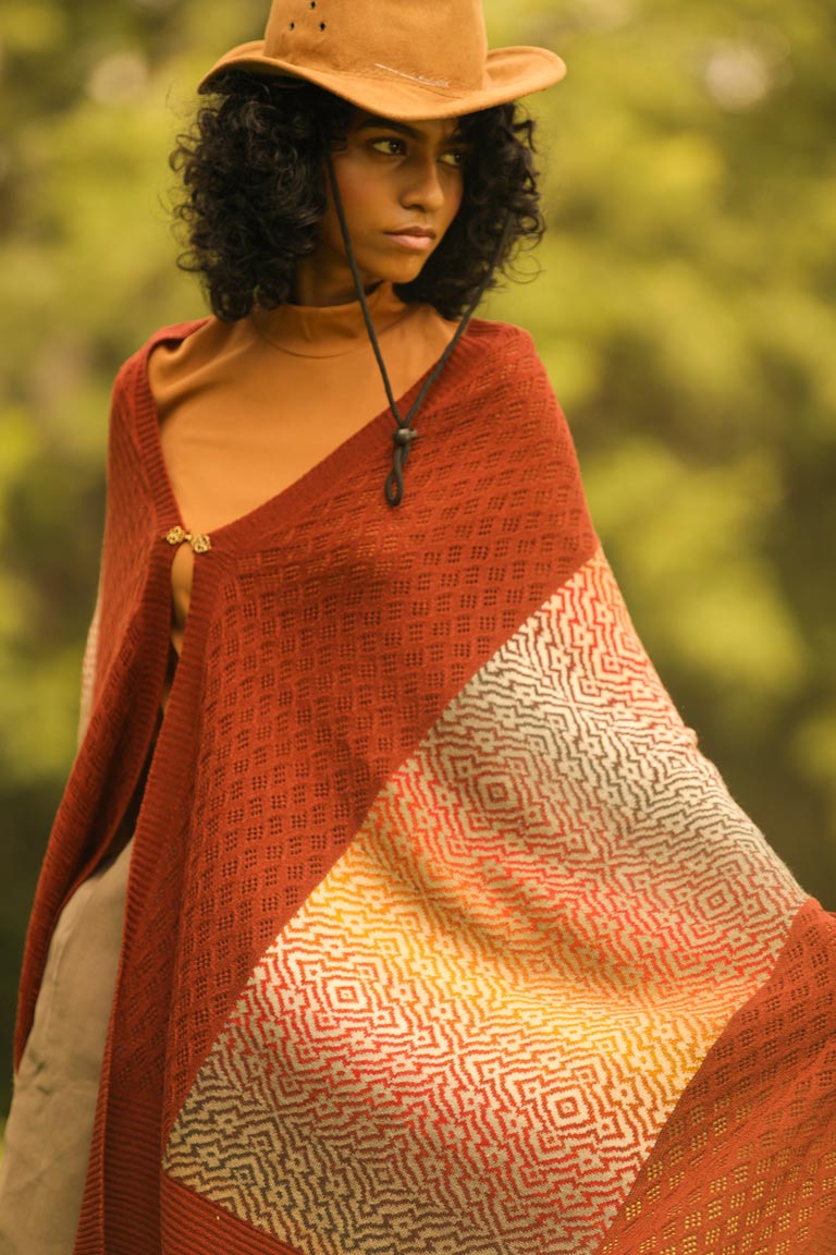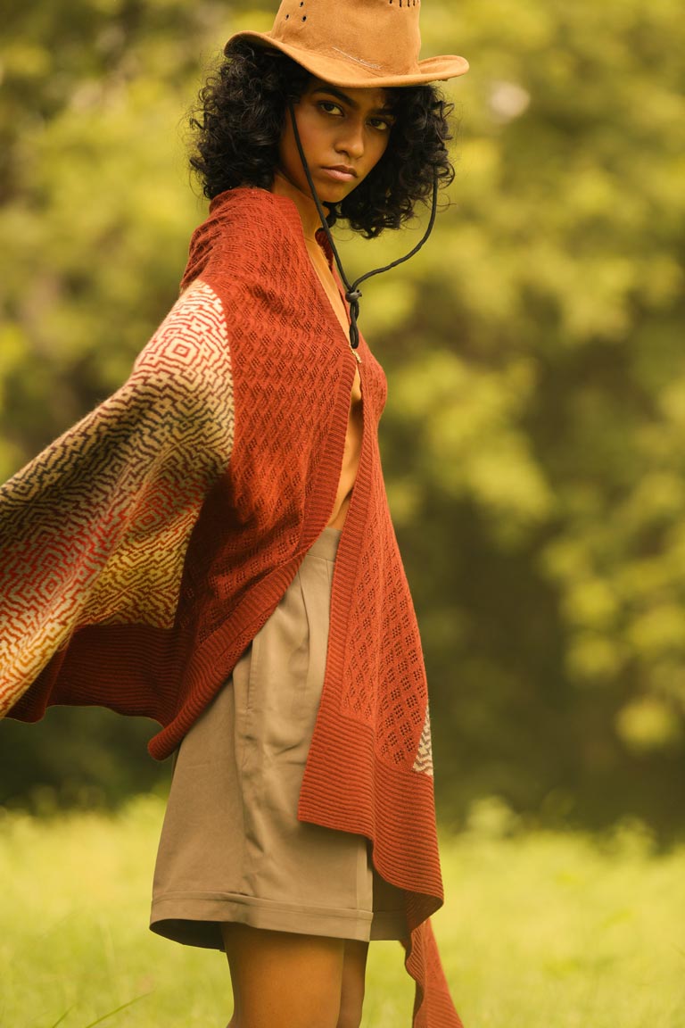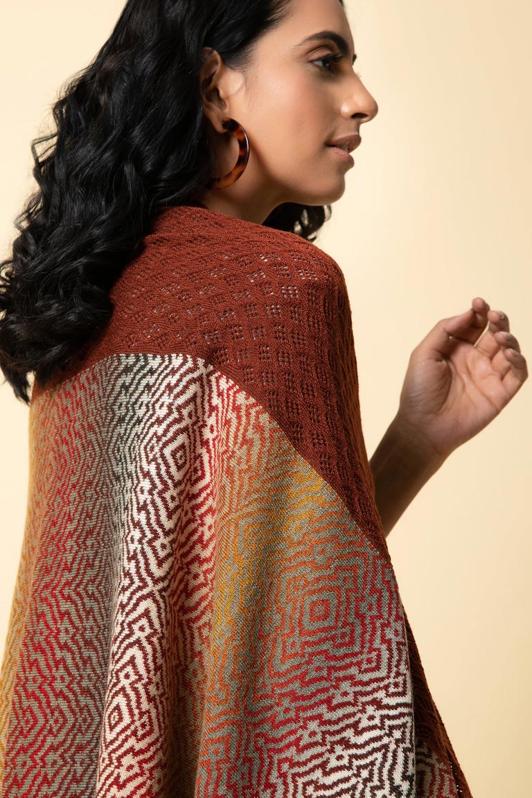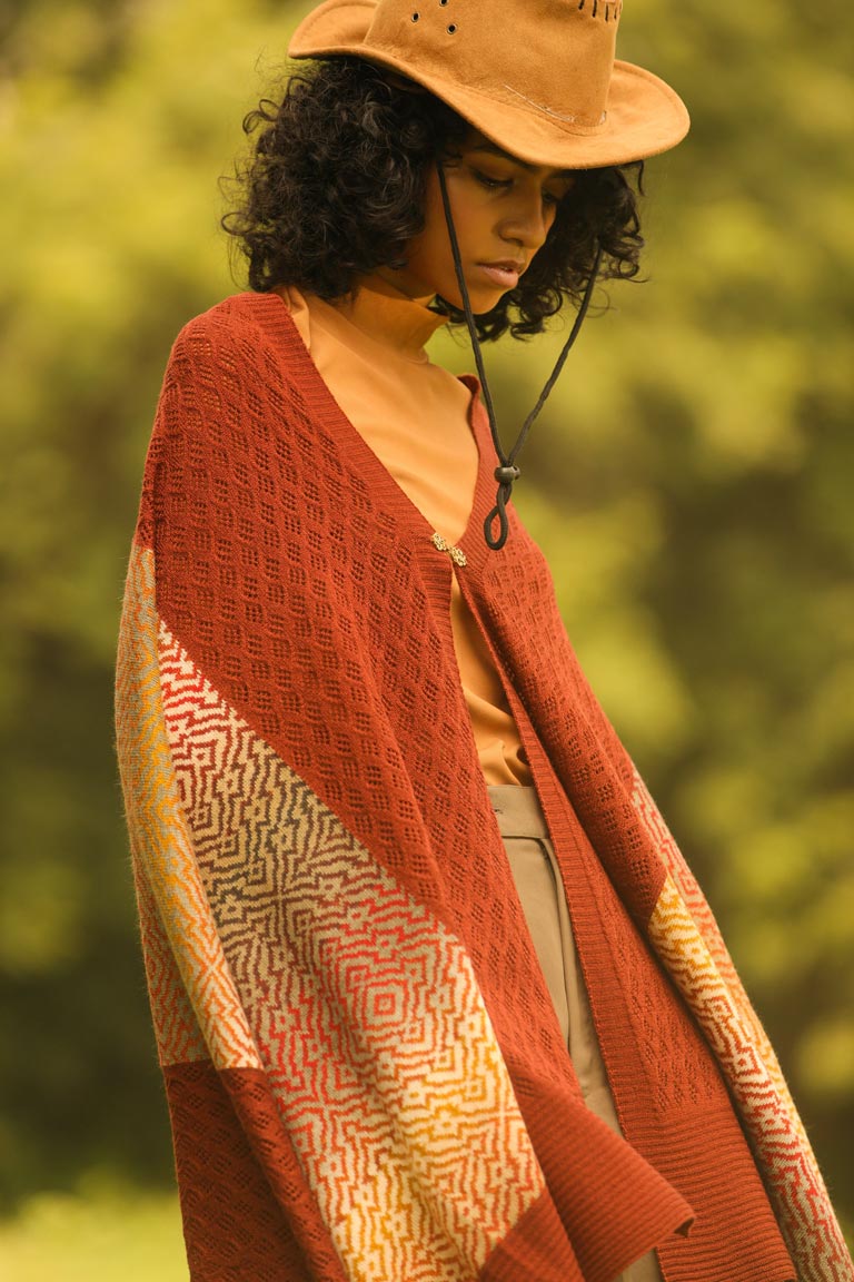 Let our earthen rust 2-in-1 wrap envelop you warmly through the coming season. Made of pure lambswool, it can be worn on one or both shoulders. The other option is to wear it in cape style by using the little hook-and-eye in the front.