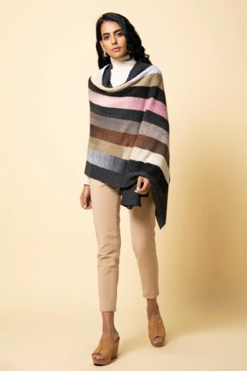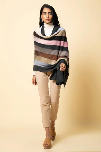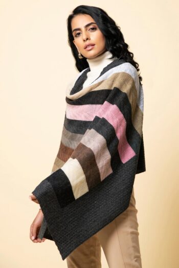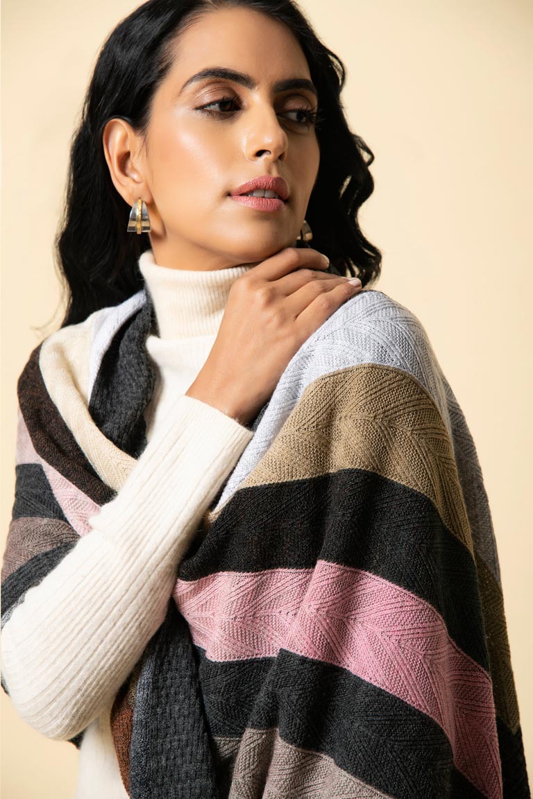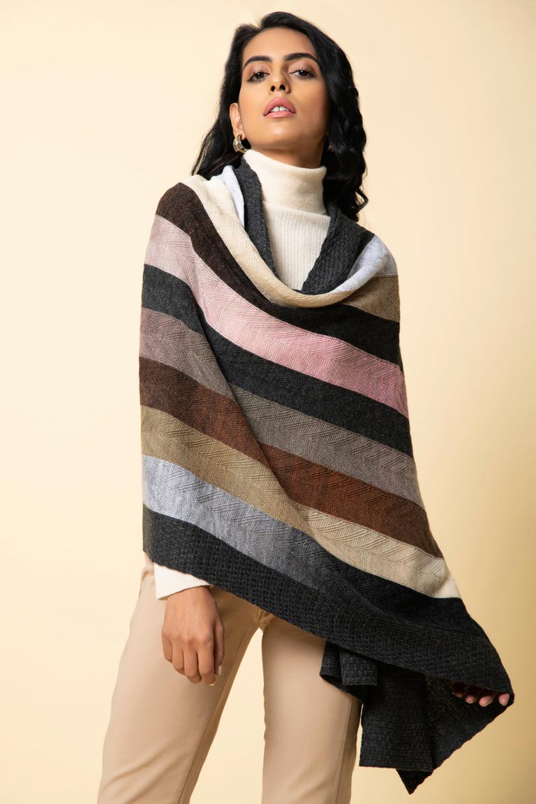 Bundle up in our striped and multi-toned wrap in a herringbone weave. This comes in an interesting colour combination that will uplift any dull winter outfit.