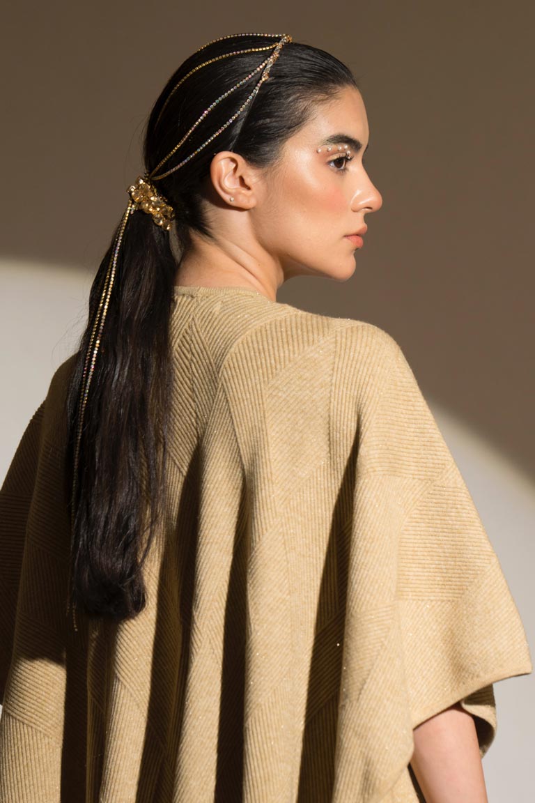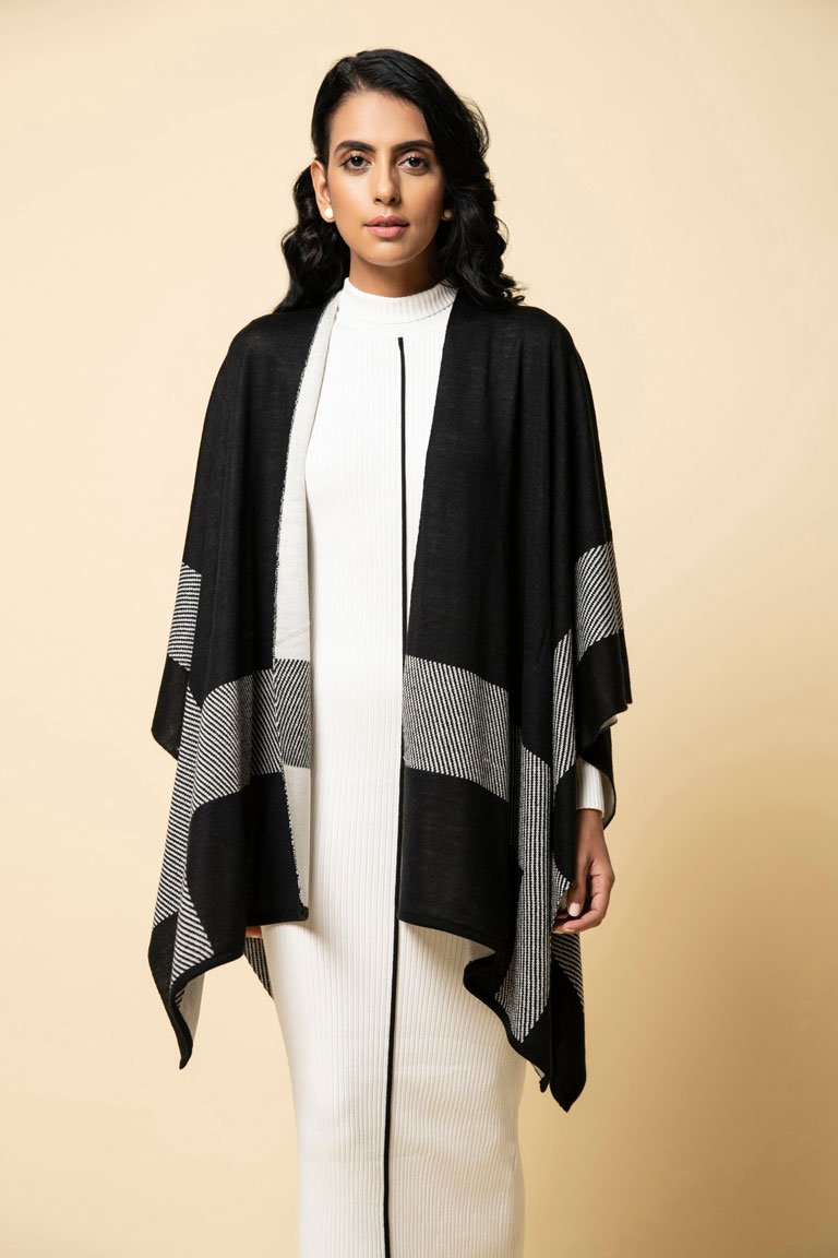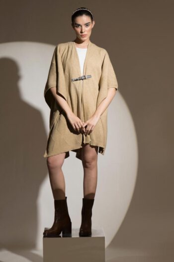 This striking cross cross patterned cape makes a strong statement of its own! In a neutral shade of beige, it can be worn with anything. It has a belt which adds some structure to the cape.